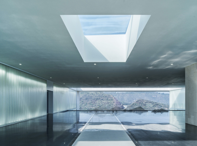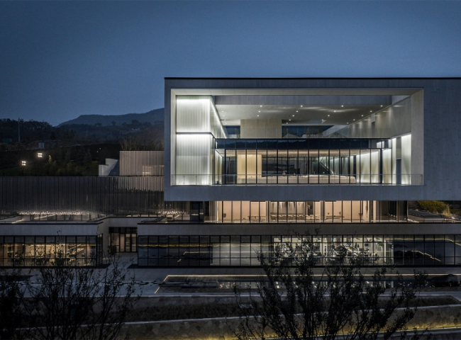 群山环抱,漫山小镇。幕墙与周边群山完美相映,融入自然。项目采用穿孔不锈钢折板、采用铝蜂窝石材复合板、室内侧双层U型玻璃