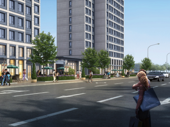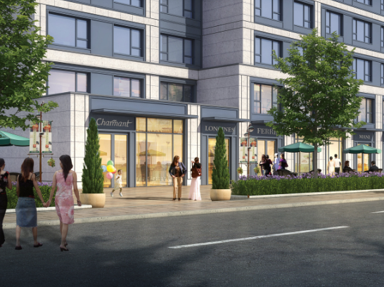 The stone curtain wall is made of champagne green B-color natural marble, and the first and second floors and parapet walls are decorated with dark gray aluminum curtain walls