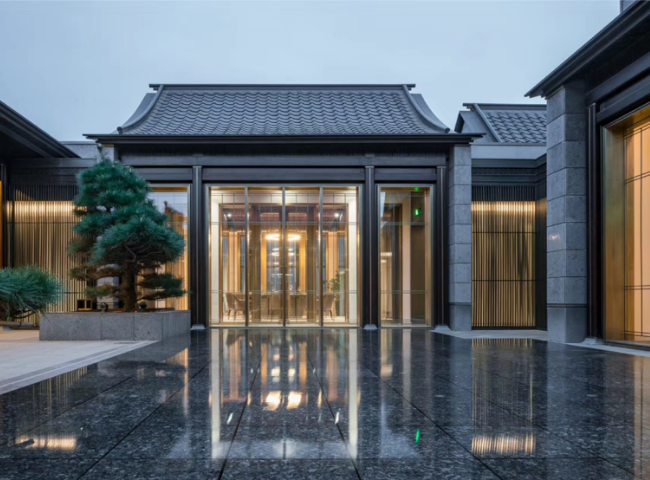 This project uses a unique copper profile curtain wall system, glass built-in high-quality copper profile grilles, and imported Portuguese gray mode-ling stone. The overall shape is unique and luxurious and low-key
