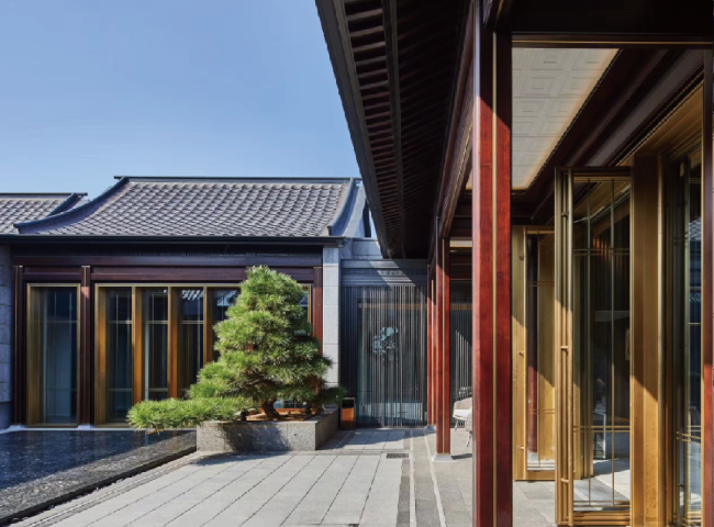Copper profile glass curtain wall, imported furniture-style teak wood, copper profile cor-nice shape, bronze door