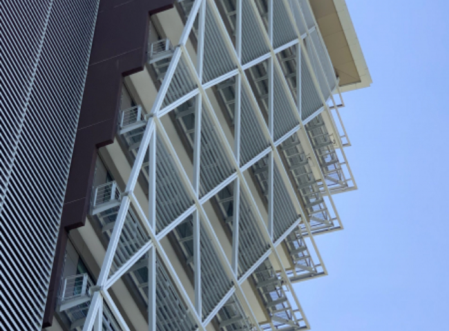 本项目为马来西亚政府新办公楼,二三层采用外倾式单元幕墙配合梭形遮阳百叶,五到八层为内倾式单元体幕墙营造曲面效果,每层设置维护通道,外侧装饰超大曲面梭形遮阳百叶;中庭采用彩釉点式玻璃幕墙,顶部采用铝板及百叶做大跨度悬挑雨棚,既凸显地方特色,又显得端庄大气